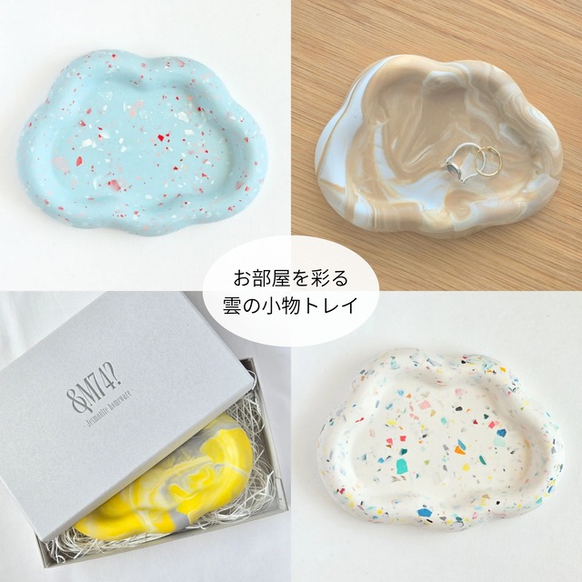 アクセサリーや鍵、小物入れに。 お部屋をやさしく彩る、雲の形の小物用トレイです。 ぷっくり、つるんとした形が特長の雲トレイは 毎日使う小物を受け止めながら、テーブルや棚の上をやさしく彩ります。 見慣れたお部屋やデスクの上に置くだけで、 インテリアのちょっとしたアクセントにも。 少しユニークな形なので、 人と少し違うものが好きな方や、個性的なインテリアが好きな方にもおすすめです。 模様は一点ものが中心となります。 お部屋に合う色や、直感で「好き」と思えるトレイをお選びください。 【おすすめの用途】 ・アクセサリー置き ・鍵や腕時計のトレイ ・イヤホンや小物入れ ・お香トレイとして 玄関、リビングテーブル、ドレッサーなど さまざまな場所でお使いいただけます。 【模様をお選びください】 ① イエロー・グレーマーブル ② くすみオレンジ ③ サンセットマーブル ④ ソーダブルー・テラゾー ⑤ パンプキンイエロー・カラフルテラゾー ⑥ カラフルテラゾーA ⑦ ブルーピンク・テラゾー ⑧ カラフルテラゾーB ⑨ 抹茶マーブル ⑩ テラコッタブラウン・イエローマーブル ⑪ クッキー&クリーム テラゾー ⑫ ブラウンマーブル サイズ/size(約): 幅(外寸・一番広い幅)15cm、縦11cm、高さ2cm 重さ:350-370g前後 ●素材・こだわりについて 「ジェスモナイト」という環境にやさしい樹脂素材を使用しています。マットで落ち着いた風合いと、手にしっくりくるほどよい重みが特徴です。細部まで仕上がりにこだわり、丁寧に仕上げています。 なかなかない雲の特徴的な形に惹かれ イギリスから型を取り寄せて製作しています。 ●ラッピングについて ロゴ入りギフトBOXに入れてお届けします。 ・新生活や引っ越し祝い ・就職祝い、送別ギフト ・お誕生日プレゼント ・母の日 ・自分へのご褒美にも 無料ラッピング→おまかせカラーのリボンがけ 有料ラッピング(+200円)→白リボンがけ&紙袋も同封しております。(ご不要な方はお申しつけください) ●お色や模様について イベントで店頭に立ち、お客様の好みの多様さを感じます。 「普段は選ばない色に惹かれました」 「置く場所を想像して選びました」 そんな出会いを大切にしてほしく、さまざまな模様でお作りしています。 ※在庫がない場合も、カラーオーダーを承っております。 お気軽にお問い合わせください。 購入時の注意点 〇製作の過程で細かな気泡が入る場合がございますが、ジェスモナイトならではの表情としてお楽しみください。 〇素材が水に弱いため、乾いた場所でご使用いただくと長くお使いいただけます。 〇汚れ防止のために薄くコーティングをしています。汚れた際は、水を含ませた柔らかい布等で拭き取り、乾かしてください。 〇食品を直接のせる用途にはご利用いただけません。 ──&M74? (アンドエムナナジュウヨン)とは── 「毎日の暮らしに、ちいさな彩りを」 一点ずつ手作りのインテリア・デスク収納雑貨を製作しています。 他の作品もぜひチェックしてみてくださいね。 https://andm74q.theshop.jp/ 製作過程やイベントなどの最新情報はInstagramにて https://instagram.com/andm74q