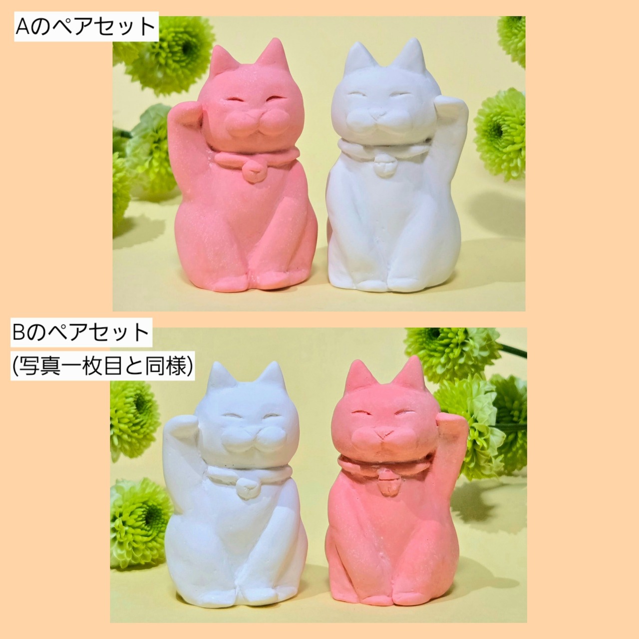 鮮やかなピンクと白ねこのペアセット。