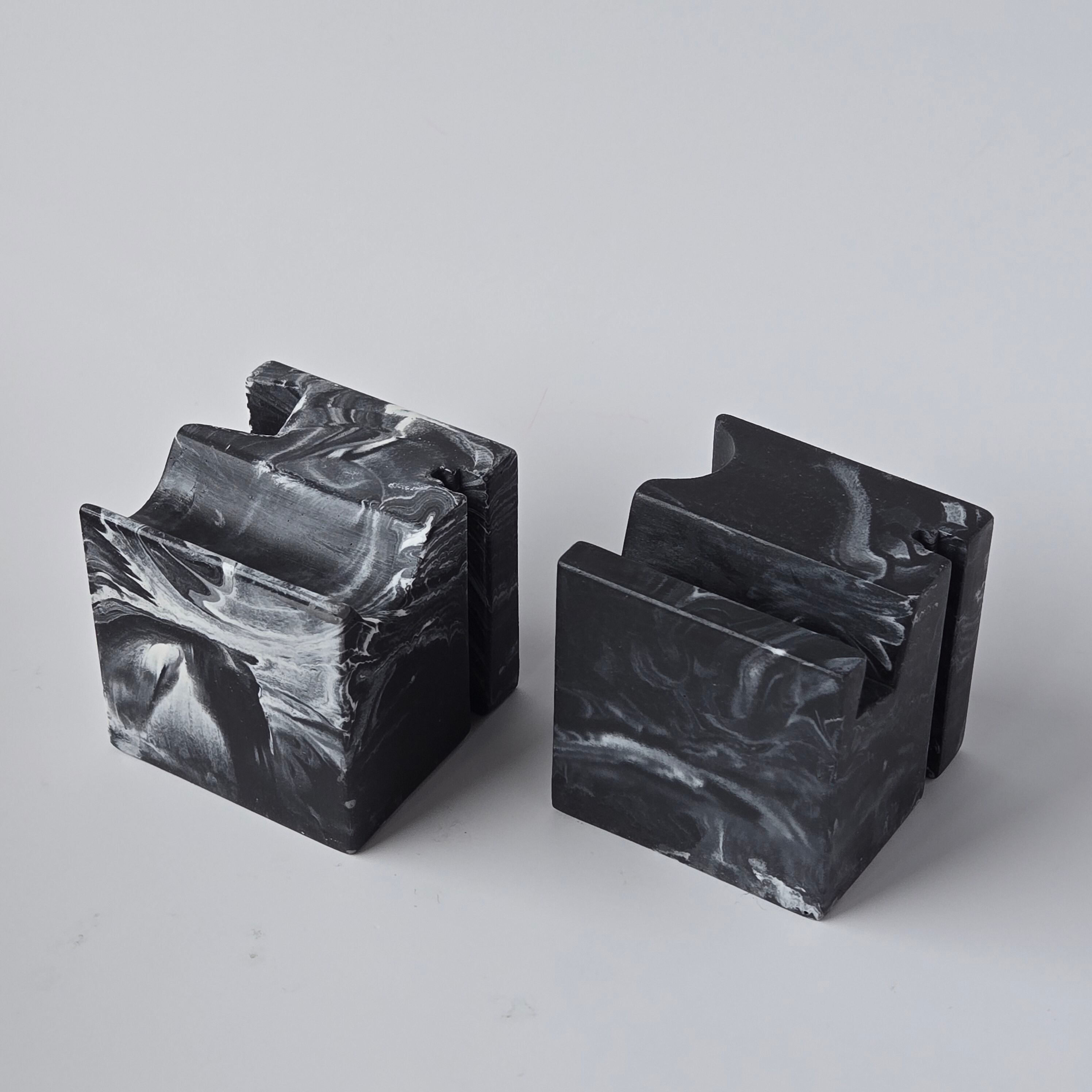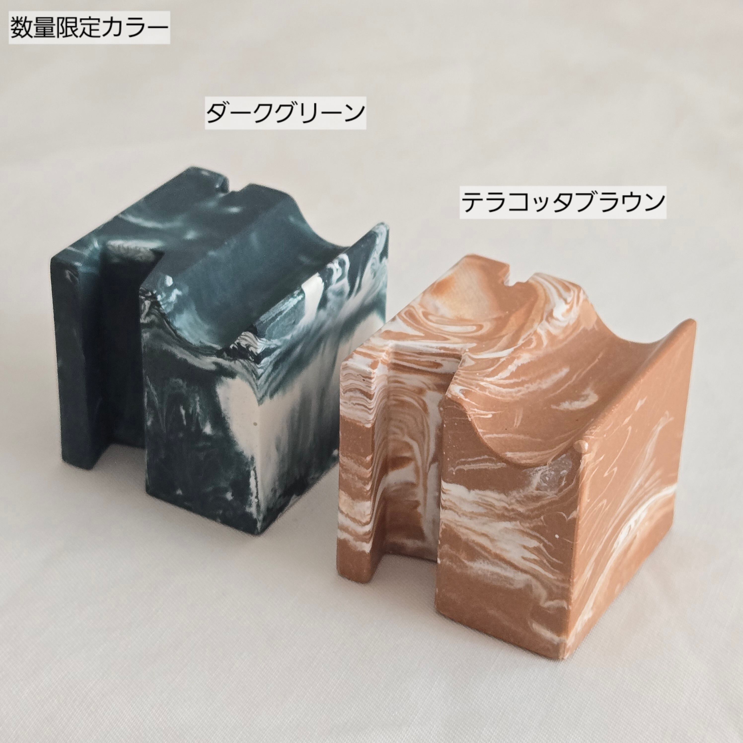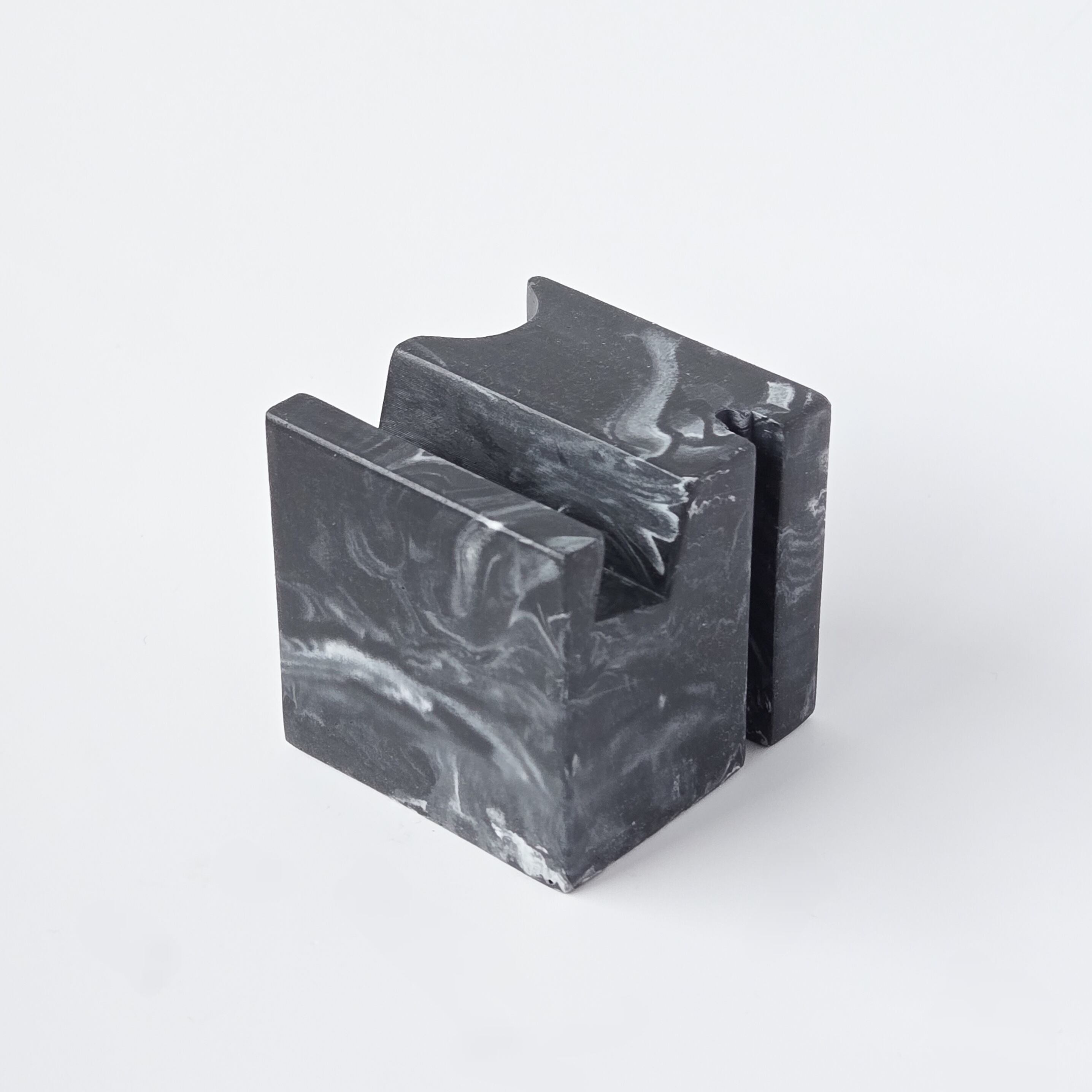 しっとりとしたマットな質感をもち、一辺約4cm程と場所を取らない小ささでありながら、石のようなほどよい重みのある素材の特性を活かしてスマートフォンやペンを支えます。