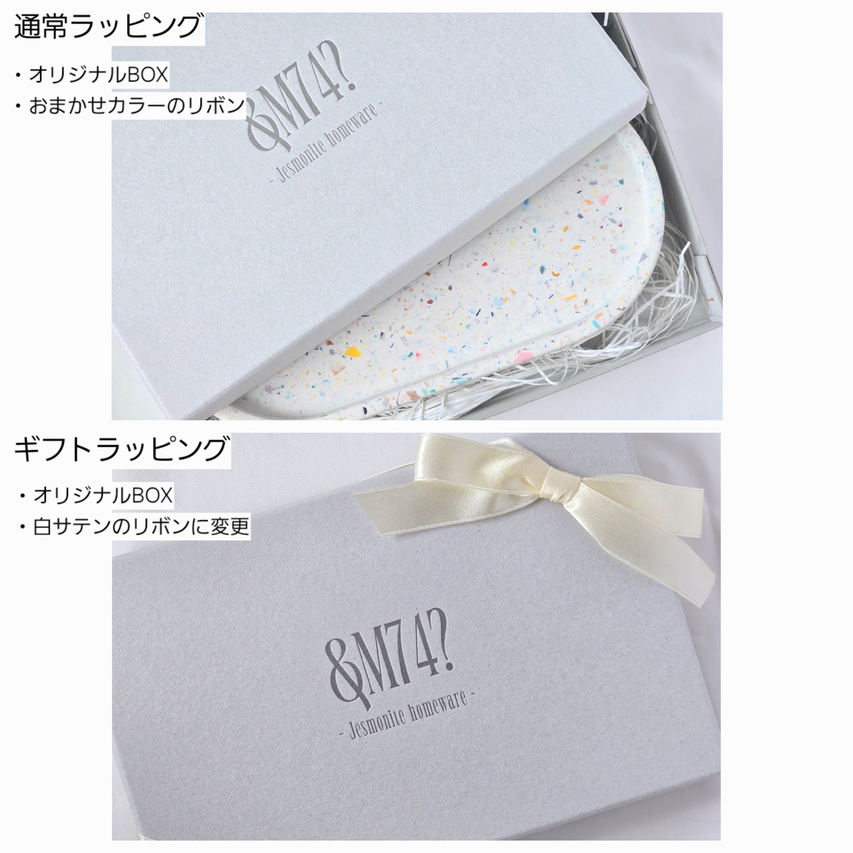 すべてのオーバルトレイは、1点ずつグレーのオリジナルBOXに入れてお届けします。ラッピングの仕上がりをオプションよりお選びいただけます。ご希望の方には、無料でお渡し用の紙袋もお付けします。