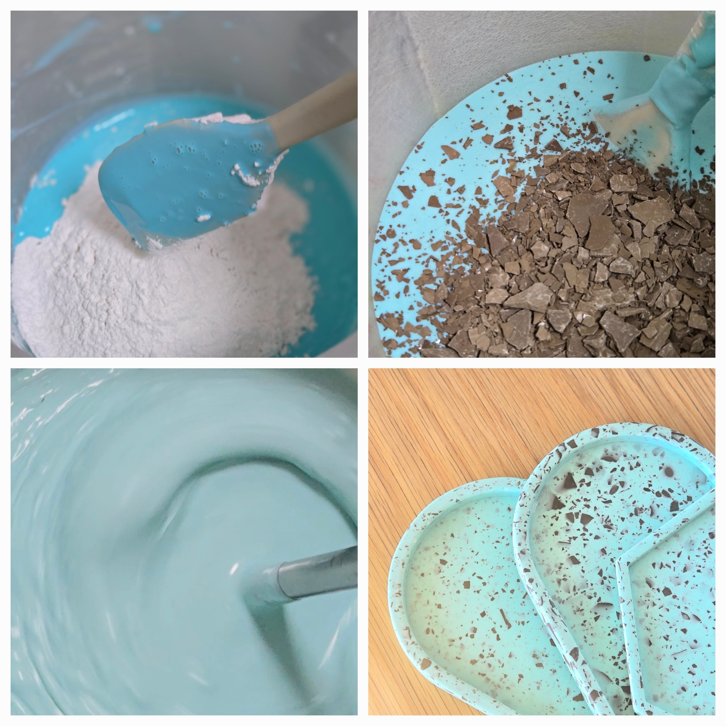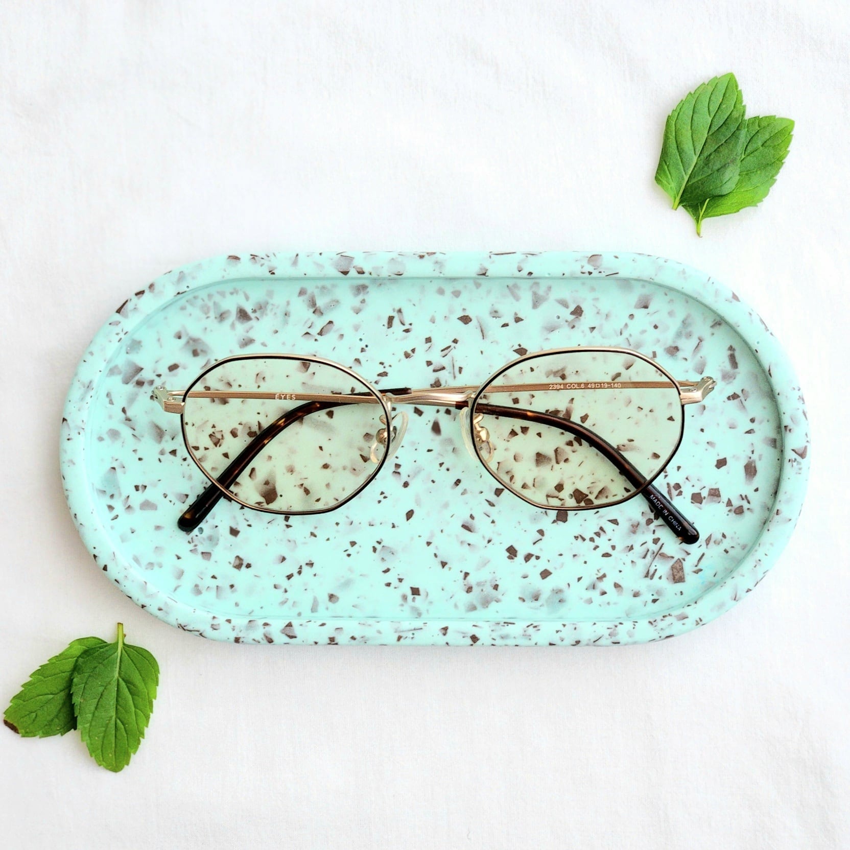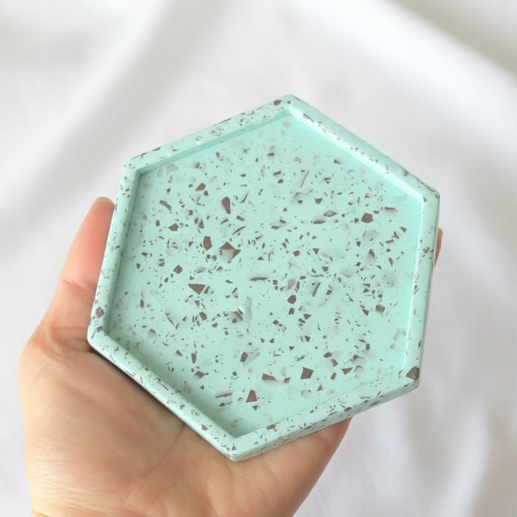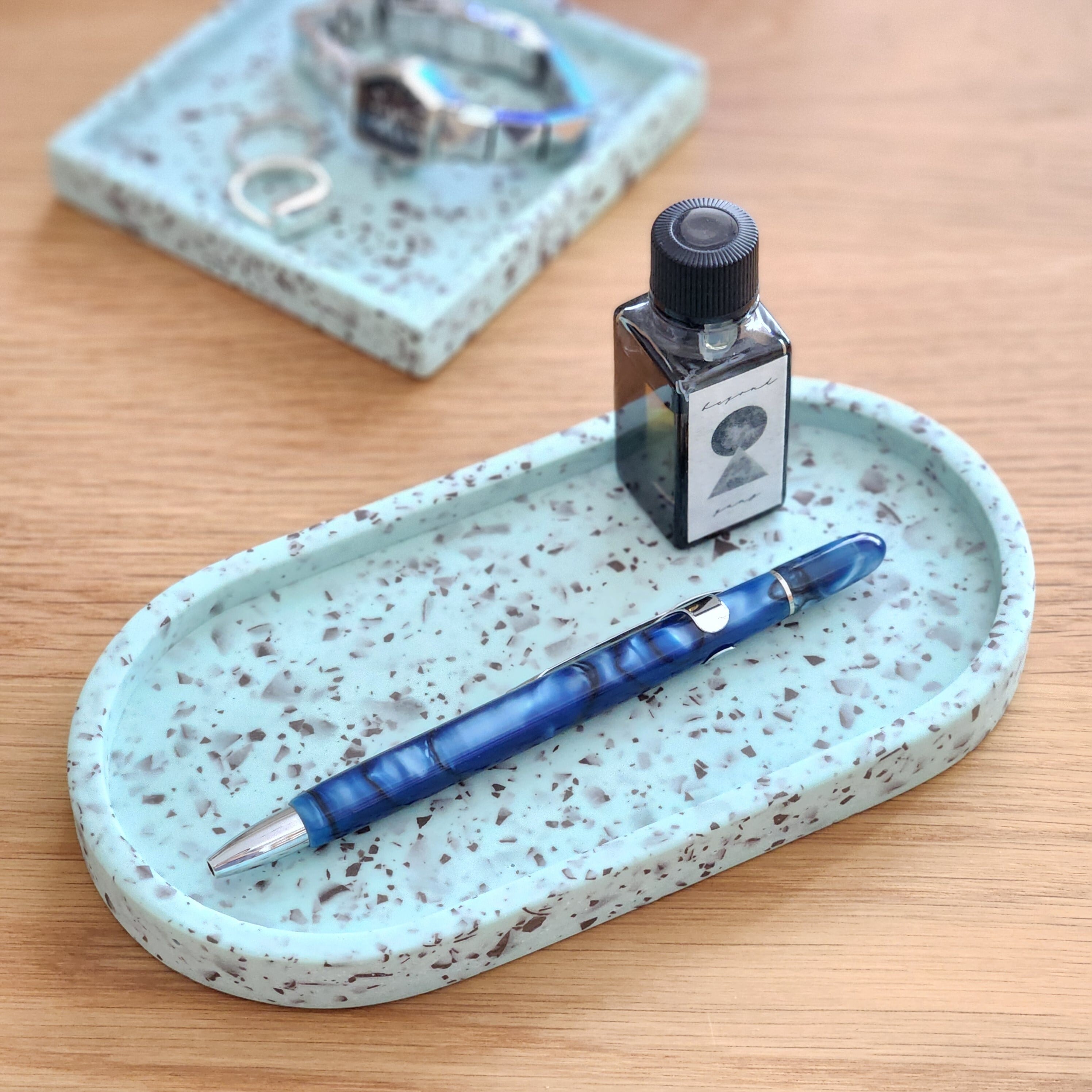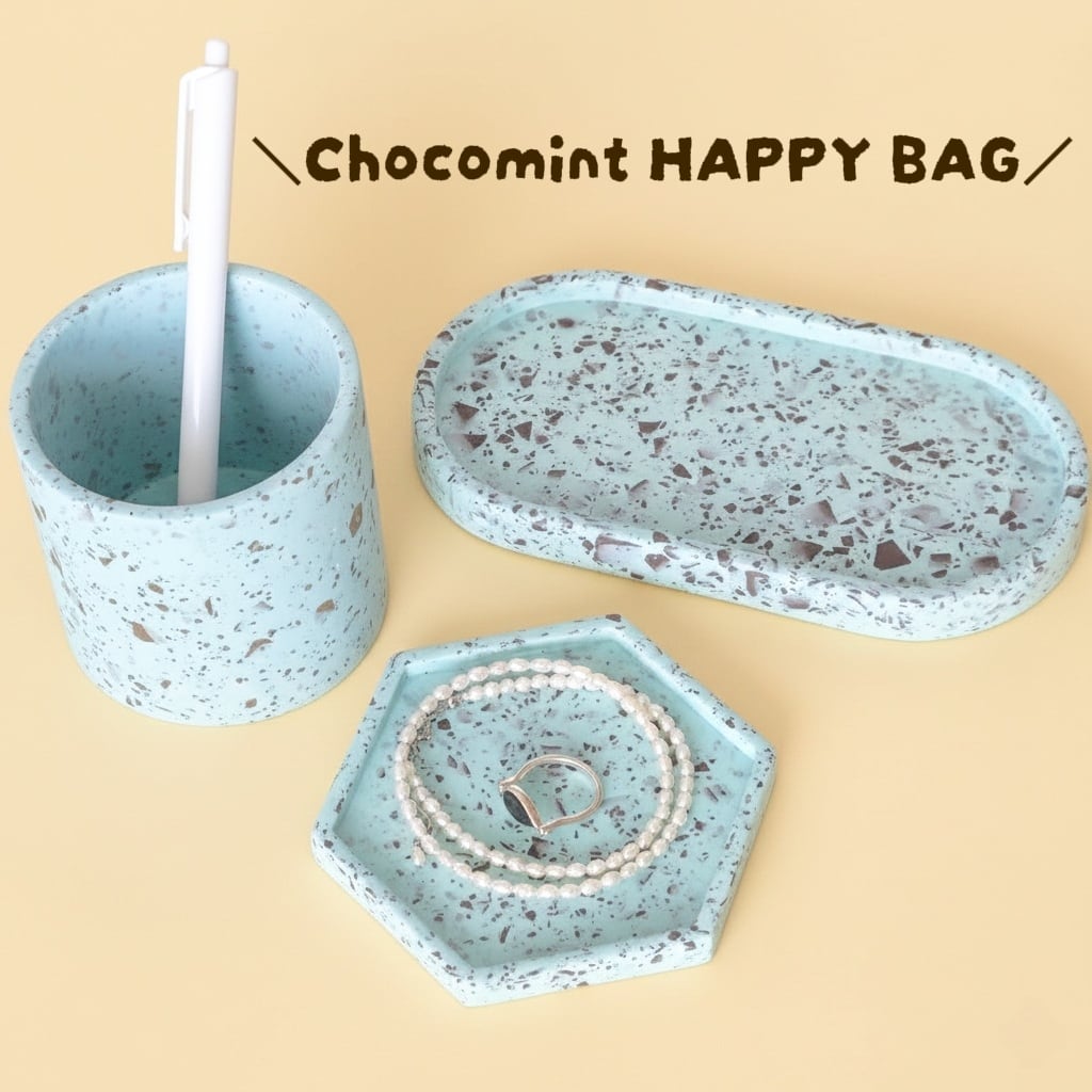 石のような質感のジェスモナイト樹脂で製作した、チョコミント模様のペン立て・オーバルトレイ・六角形トレイのハッピーバッグ。今だけの大変お得なセットです☆