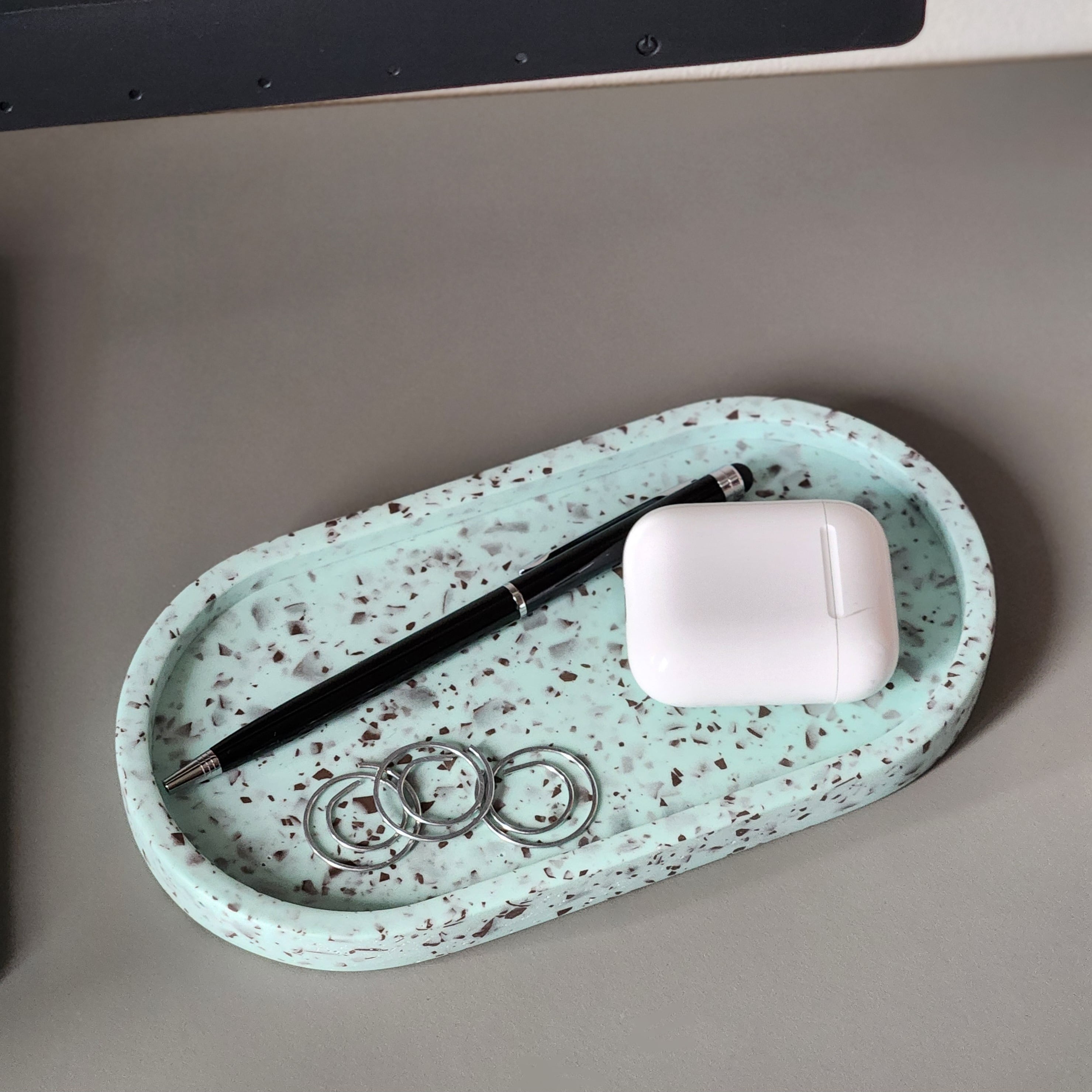 お片付けがちょっとだけ楽しくなるような、チョコミント模様のペン立てとトレイはマルチユースでアクセサリーや鍵、腕時計、ペンやめがね置き、デスクの整理整頓にぴったり。