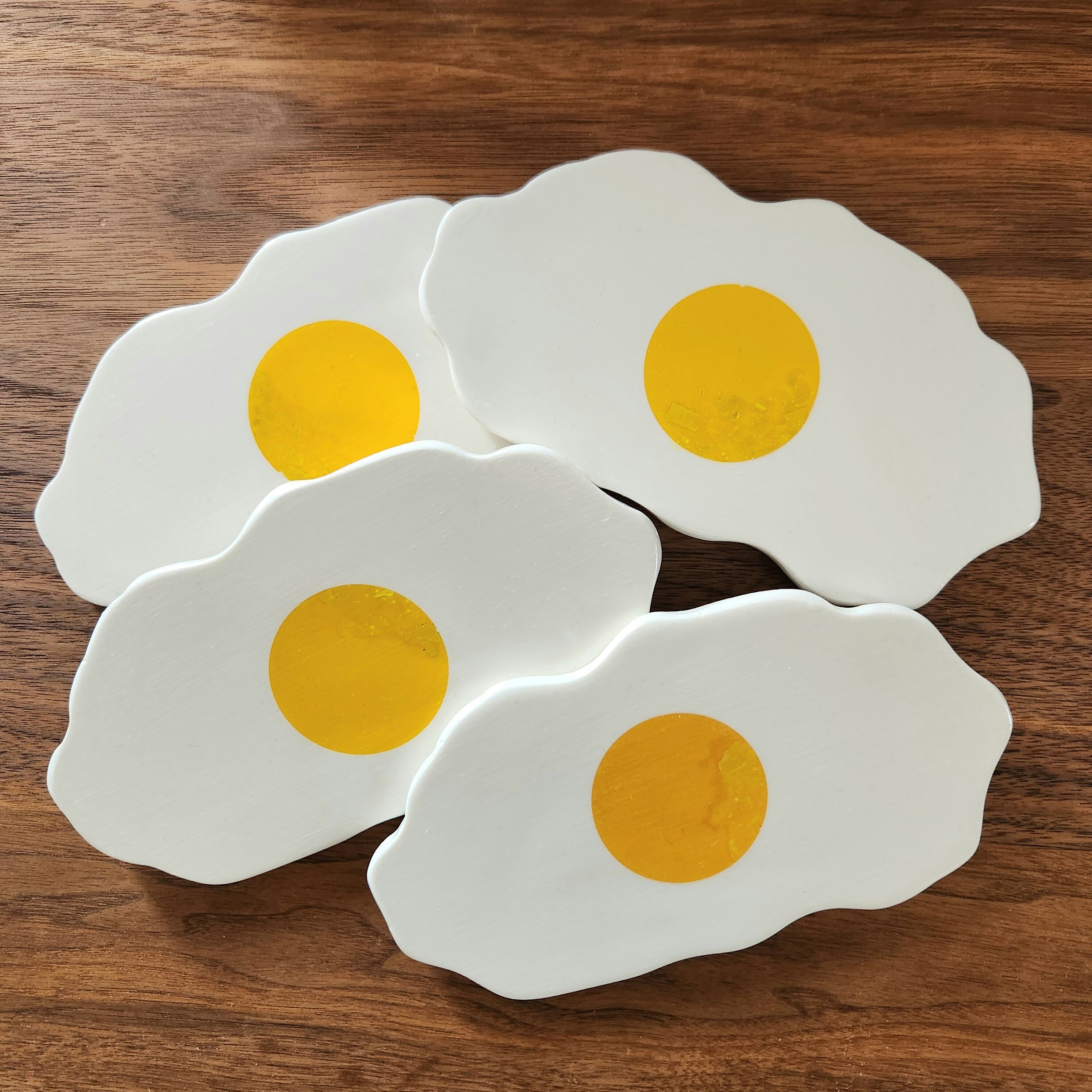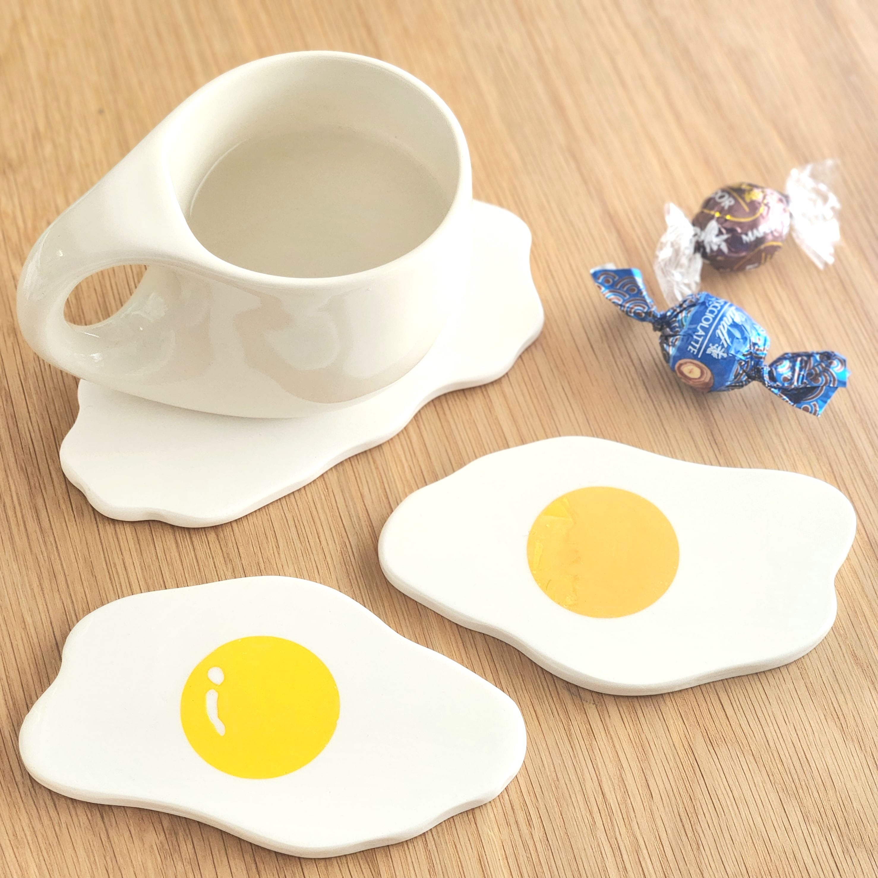 まるで朝食のワンシーンをそのまま切り取ったような、たまごモチーフのコースターです。